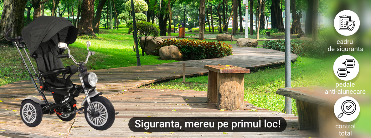 Tricicleta Mavio este prevazuta cu centura de siguranta in trei puncte si un scaun confortabil, din material respirabil, iar pedalele usoare si rotile din cauciuc ii vor asigura o calatorie lina.