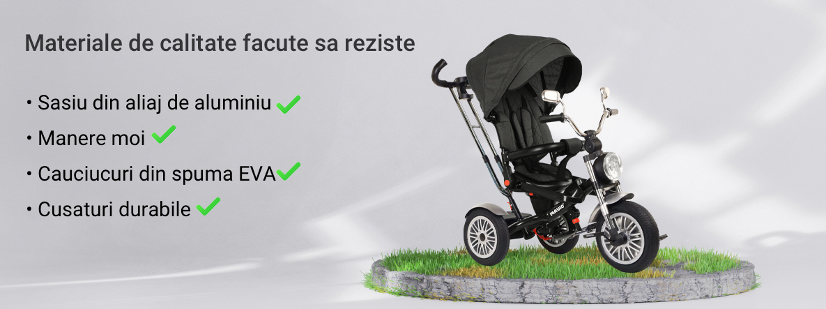 Tricicleta Mavio este fabricata din materiale de calitate, un cadru solid din aluminiu, plastic ABS rezistent si roti potrivite pentru toate tipurile de teren.